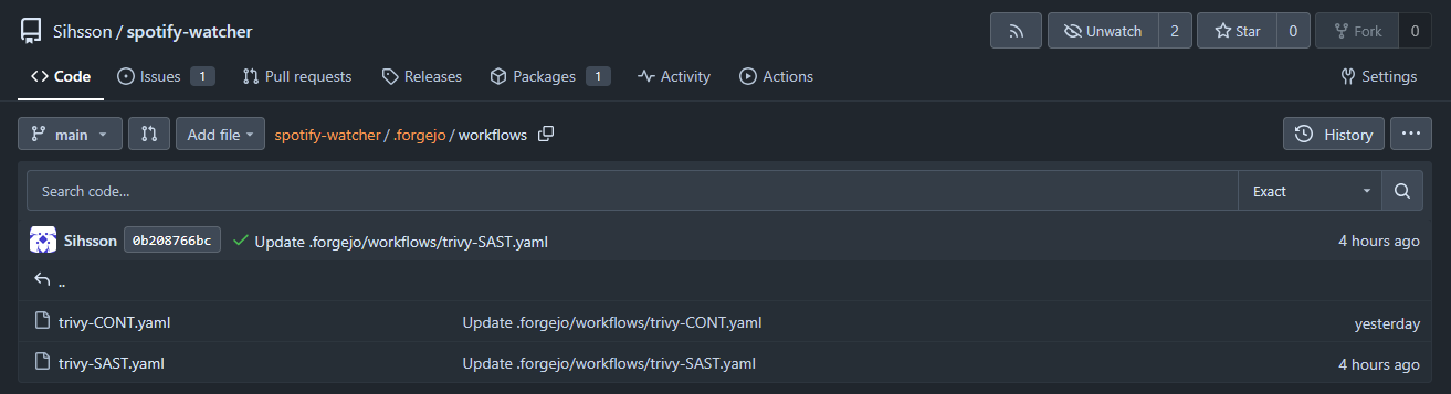 You will want to create two Forgejo Actions, one for container images running only when a new image is pushed / updated trivy-CONT.yaml. Another one for the repository scan whenever a push / pull request is made trivy-SAST.yaml. These files will need to be located at : <your-repo-root-folder>/.forgejo/workflows/.